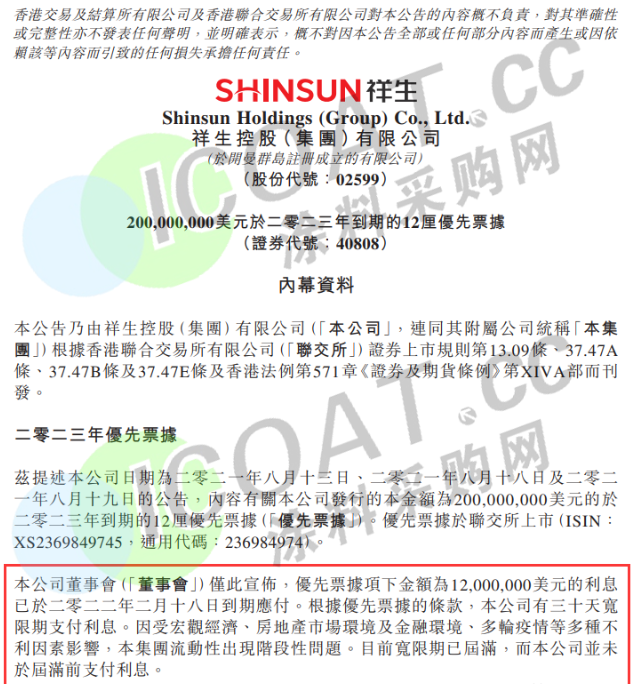 祥生控股公告稱,公司未能按期支付2億美元債1200萬美元利息。公告顯示,祥生控股集團(tuán)2億美元優(yōu)先票據(jù)項下1200萬美元的利息已于2022年2月18日到期應(yīng)付。因多種不利因素影響,祥生控股集團(tuán)流動性出現(xiàn)階段性問題,在30天寬限期屆滿時仍未支付利息。