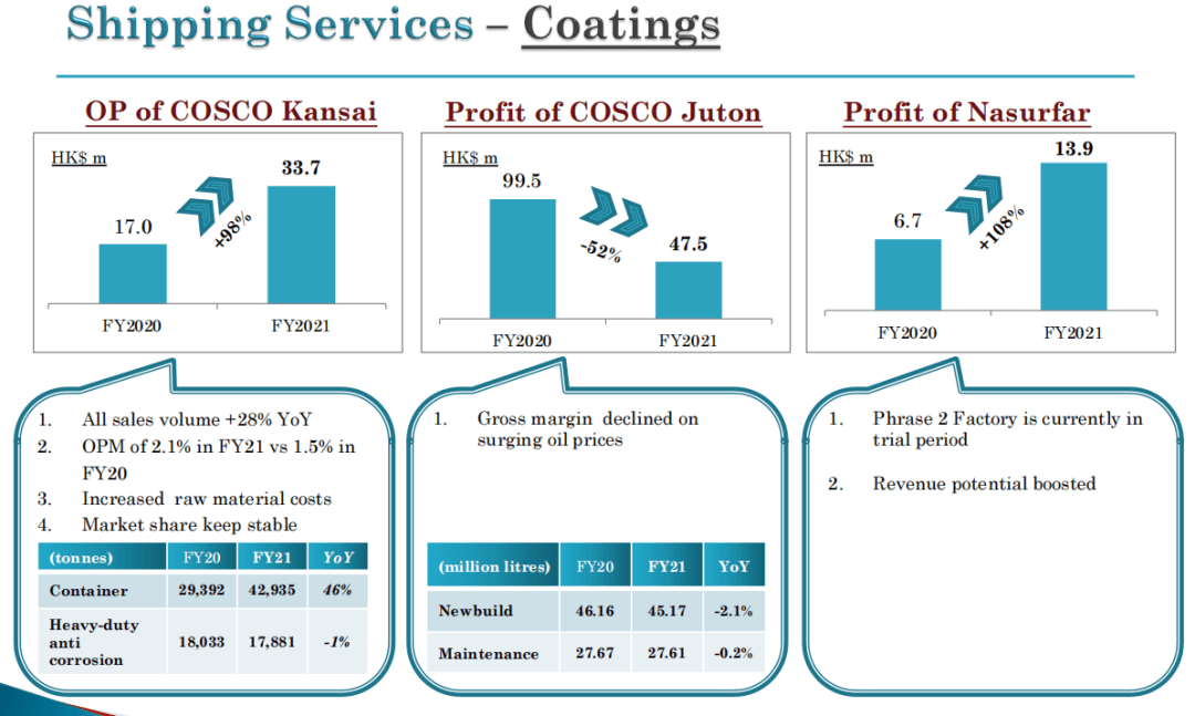 集裝箱涂料方面,中遠關西公司在受惠于集裝箱制造市場強勁復甦的同時,主動強化涂料科研開發,進一步提升產品質量,強化營銷服務,年內,集裝箱涂料銷售量同比上升46%至42935噸。工業用重防腐涂料含車間底漆銷售量為17881噸,同比下跌1%。