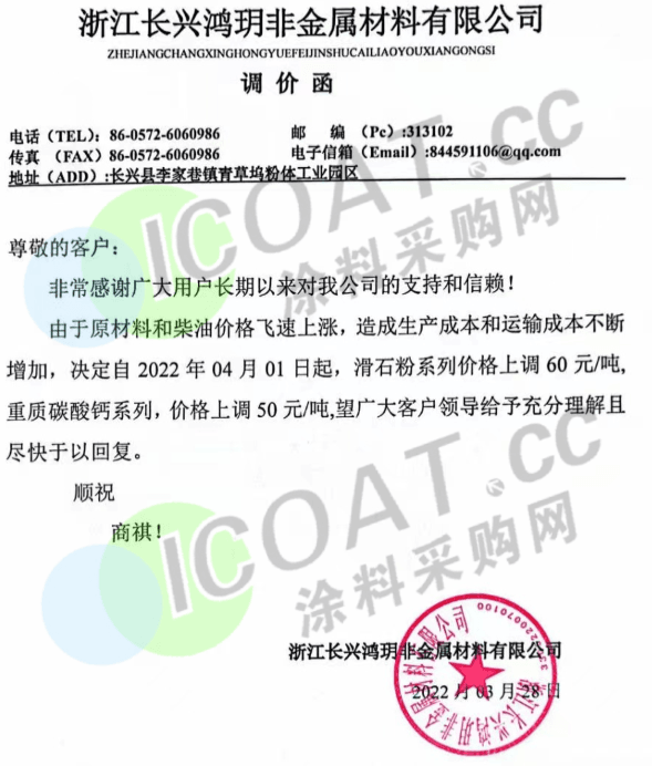 近日,浙江長(zhǎng)興鴻玥非金屬材料有限公司發(fā)布調(diào)價(jià)函,稱由于原材料和柴油價(jià)格飛速上漲,造成生產(chǎn)成本和運(yùn)輸成本不斷增加,決定自4月1日起,滑石粉系列價(jià)格上調(diào)60元/噸,重質(zhì)碳酸鈣系列價(jià)格上調(diào)50元/噸。