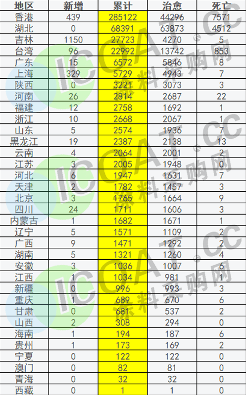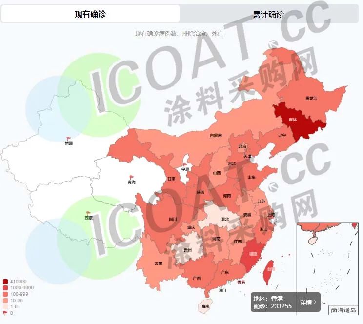 截至目前,香港累計確診285122例,湖北累計確診68391例,吉林累計確診27723例,臺灣累計確診22992例,以上城市累計確診均超過萬例。廣東累計確診6572例,上海累計確診5729例,陜西累計確診3221例,河南累計確診2814例,另有多個城市累計確診超過千例。