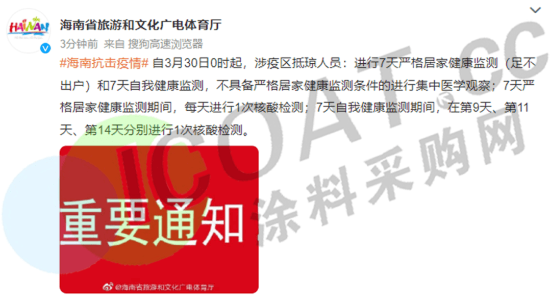 海南省表示,自3月30日0時起,涉疫區抵瓊人員:進行7天嚴格居家健康監測(足不出戶)和7天自我健康監測,不具備嚴格居家健康監測條件的進行集中醫學觀察;7天嚴格居家健康監測期間,每天進行1次核酸檢測。