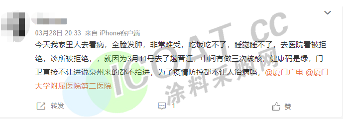 某網友表示,家人生病去醫院遭拒診,盡管健康碼和核酸檢測都是合格的,但仍遭醫院拒絕。