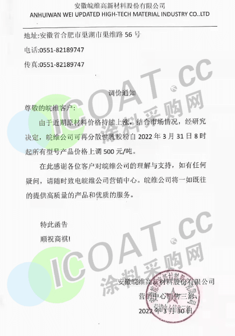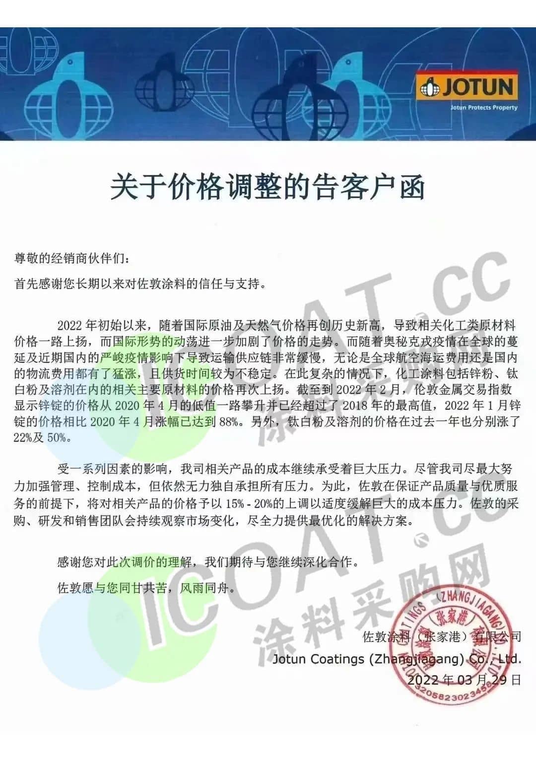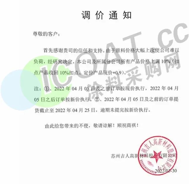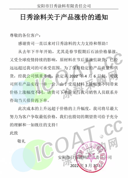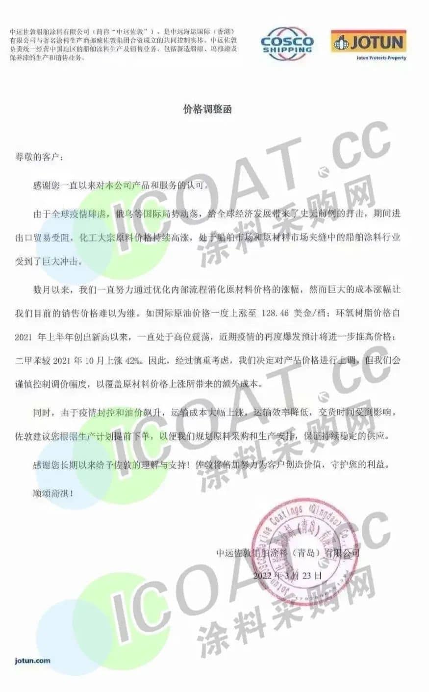 除此之外,佐敦涂料也于近期連發兩函宣漲。佐敦涂料(張家港)有限公司表示,將對相關產品的價格予以15%—20%的上調,以適度緩解巨大的成本壓力。