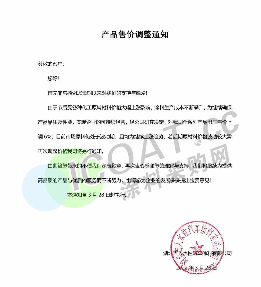 而在一周之前,吉人涂料曾發布產品調價通知,稱3月28日起,全系列產品出廠售價上調6%。