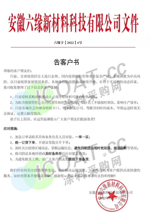 安徽六緣新材料:加急訂單一單一議,統一訂貨下單,建議經銷商及時備庫存,客戶提前下單備貨。