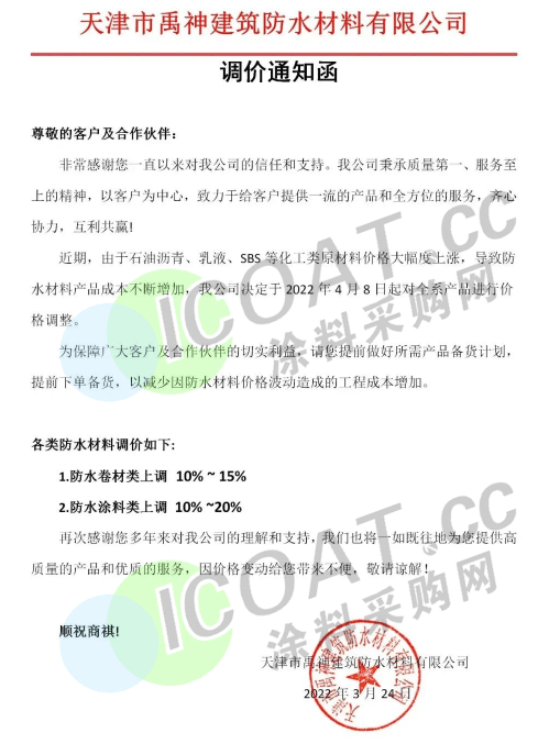 禹神建筑防水材料:4月8日起,防水卷材類上調10%—15%,防水涂料類上調10%—20%。