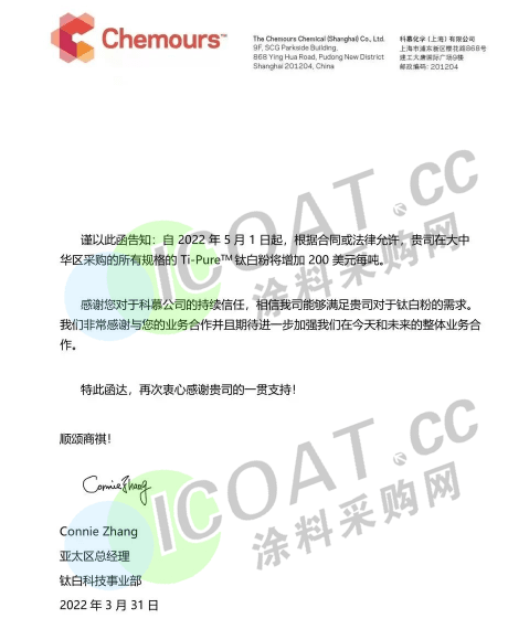科慕:5月1日起,大中華區采購的所有鈦白粉上漲200美元/噸。