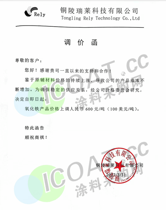 銅陵瑞萊科技有限公司:3月31日起對氧化鐵產品價格上調人民幣600元/噸(100美元/噸)。