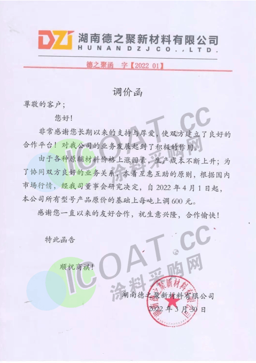 湖南德之聚新材料:4月1日起,所有型號產品原價的基礎上每噸上調600元。