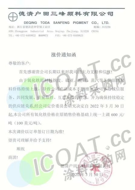 德清戶田三峰顏料:3月30日起,所有氧化鐵價格在原銷售價格基礎上統一上調600元/噸(100美元/噸)。