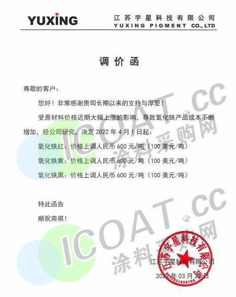 江蘇宇星科技:4月1日,氧化鐵紅、氧化鐵黃、氧化鐵黑價格上調600元/噸(100美元/噸)。