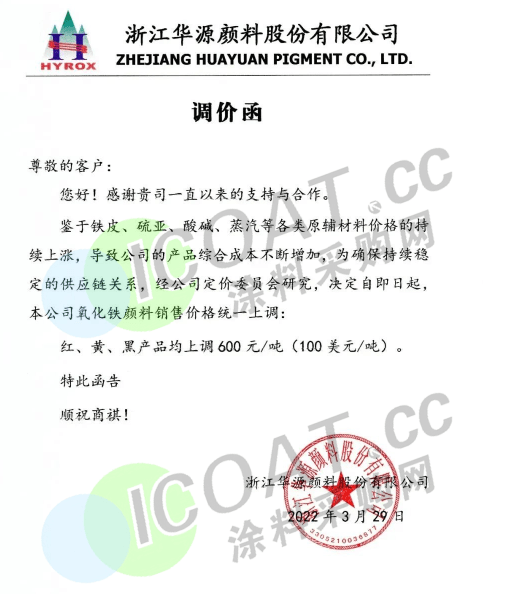 浙江華源顏料:即日起,氧化鐵紅、黃、黑產品均上調600元/噸(100美元/噸)。
