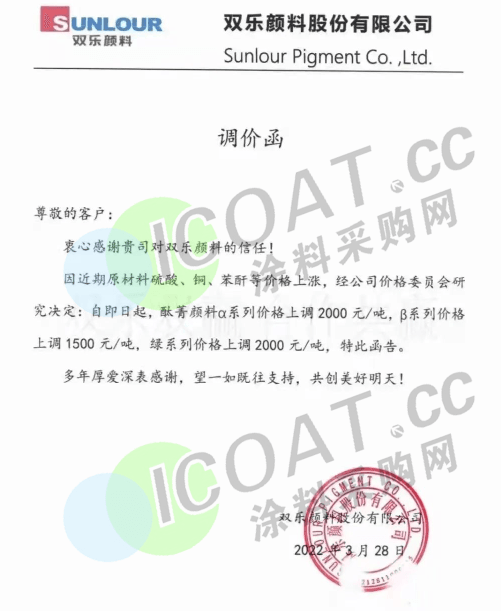 雙樂顏料:即日起,酞菁顏料α系列價格上調2000元/噸,β系列價格上調1500元/噸,綠系列價格上調2000元/噸。