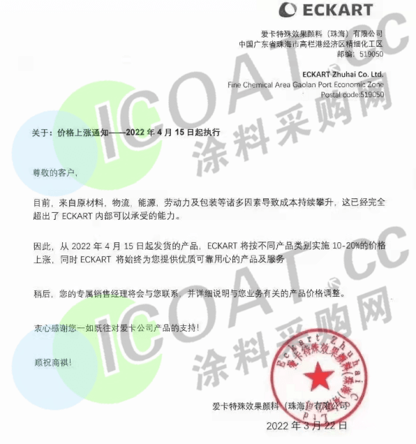 愛卡特殊效果顏料:4月15日起發貨的產品,ECKART將按不同產品類別實施10%-20%的價格上漲。