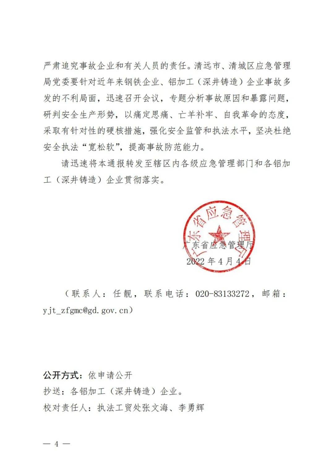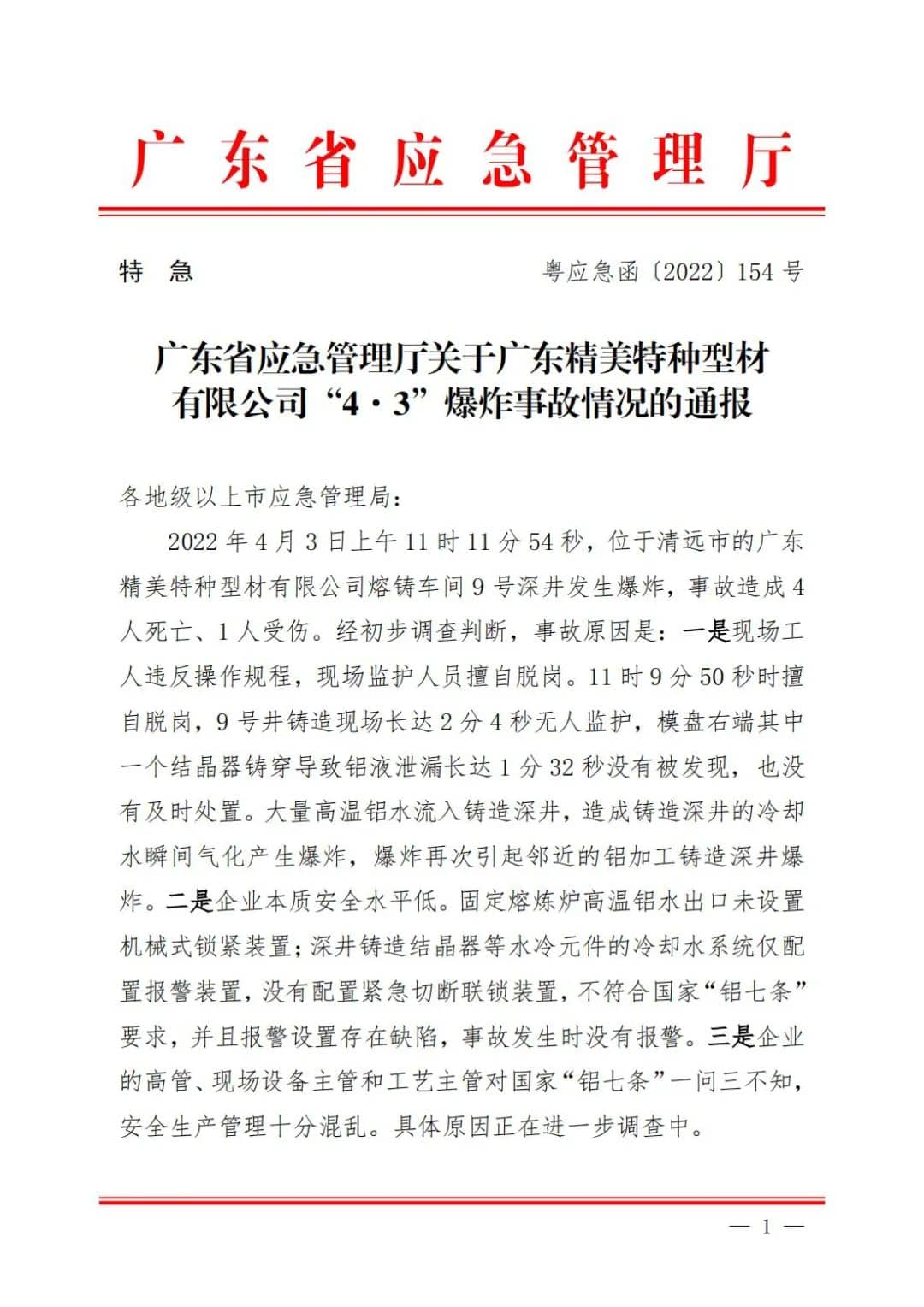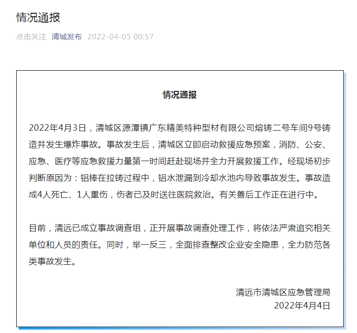 通報稱,2022年4月3日,清城區源潭鎮廣東精美特種型材有限公司熔鑄二號車間9號鑄造井發生爆炸事故。事故發生后,清城區立即啟動救援應急預案,消防、公安、應急、醫療等應急救援力量第一時間趕赴現場并全力開展救援工作。經現場初步判斷原因為:鋁棒在拉鑄過程中,鋁水泄漏到冷卻水池內導致事故發生。事故造成4人死亡、1人重傷,傷者已及時送往醫院救治。有關善后工作正在進行中。