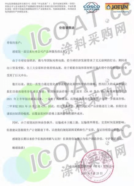 近日,中遠佐敦船舶涂料(青島)有限公司發布價格調整函,稱近期全球疫情肆虐、俄烏國際局勢動蕩,給全球經濟發展帶來了史無前例的打擊,處于船舶市場和原材料市場夾縫中的船舶涂料行業受到了巨大沖擊,且原材料的巨大成本漲幅讓企業目前的銷售價格難以為繼,因此決定對產品價格進行上調。