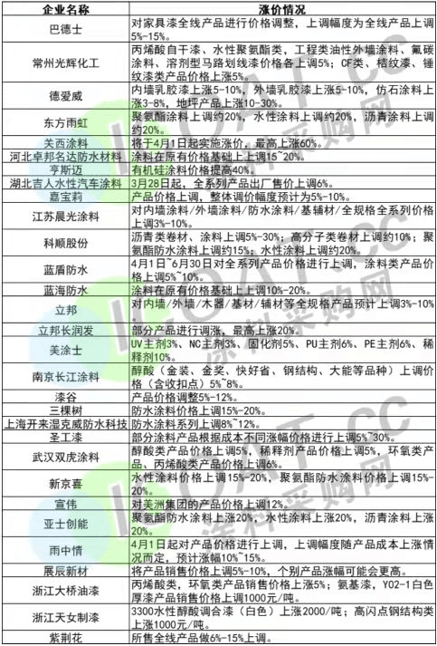 為應對成本提高等壓力,眾多涂料企業奮起反抗。年后開工訂單還未恢復,涂料企業便開啟了新一輪漲價。這其中包括了三棵樹、立邦等建筑涂料,展辰、巴德士等家具漆,以及七維等水性涂料,齊魯、樂化等油性涂料,科順、東方雨虹等防水涂料等,平均漲幅在13%左右。還有一些企業發布了調價預警函,稱近期將根據行情變化進行漲價。