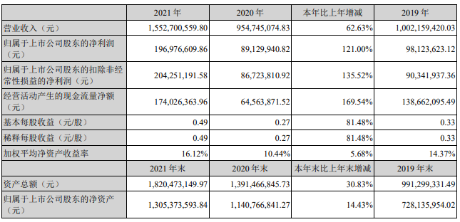 近日,惠云鈦業發布年報,2021年公司實現營業收入15.53億元,同比增長62.63%;歸屬于上市公司股東的凈利潤為1.97億元,同比增長121%;歸屬于上市公司股東的扣非凈利潤為2.04億元,同比增長135.52%;基本每股收益為0.49元,2020年為0.27元。