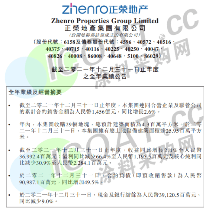 正榮地產(chǎn):正榮地產(chǎn)累計(jì)合約銷售金額為1456億元,同比增長(zhǎng)2.6%;實(shí)現(xiàn)收入369.92億元,同比增長(zhǎng)2.4%;毛利53.82億元,同比減少22.04%;歸屬股東凈利潤(rùn)8.09億元,同比減少69.48%;核心純利22.84億元,同比減少30.9%。
