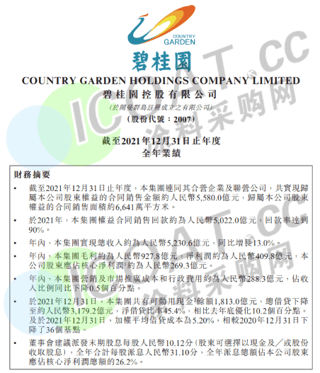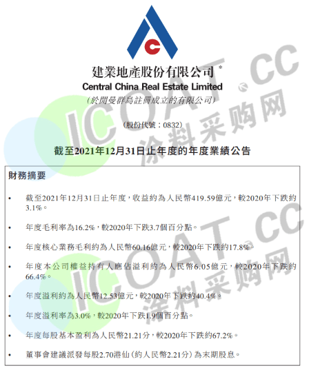 建業(yè)地產(chǎn):全年合約銷售額為601.05億元,同比2020年減少約12%;建業(yè)地產(chǎn)收益約為419.59億元,同比下跌3.1%,物業(yè)銷售收益由2020年約416.07億元減少2.2%至2021年約407.09億元;毛利約為68.11億元,同比減少20.8%;毛利率約16.2%,同比下跌3.7%;凈利潤(rùn)約12.53億元,同比減少40.4%。