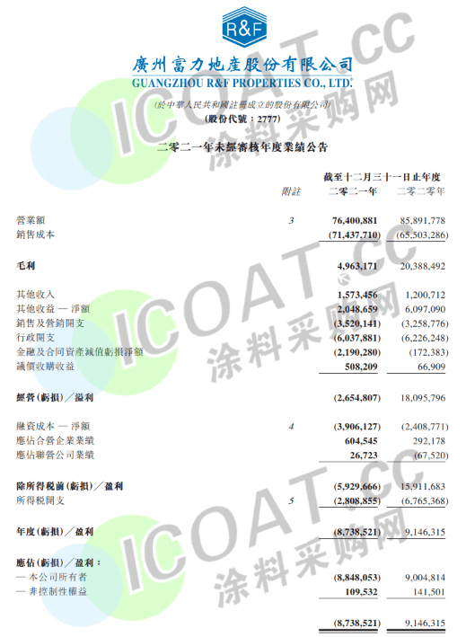 富力地產(chǎn):2021年富力地產(chǎn)實(shí)現(xiàn)收入764億元(人民幣,下同),同比減少11.05%,包括按平均售價(jià)每平方米8300元入賬建筑面積831萬(wàn)平方米;毛利49.63億元,同比減少75.66%,歸屬股東凈虧損88.48億元。富力地產(chǎn)合約銷售總額為1202億元,銷售總建筑面積941萬(wàn)平方米。新增土地資本開支總額僅為30億元,較2020年減少80%。