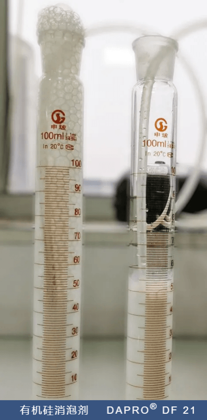 鼓泡測試的結果(如下圖),同樣可以看出,使用有機硅消泡劑的試樣,氣泡很快就充滿量筒,而使用DAPRO®DF 21的試樣,鼓泡1個小時,還具有優異的抑泡性能:
