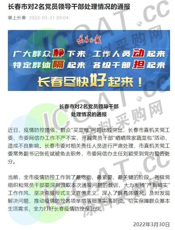 近日,“掌上長(zhǎng)春”公眾號(hào)發(fā)布《長(zhǎng)春市對(duì)2名黨員領(lǐng)導(dǎo)干部處理情況的通報(bào)》,稱長(zhǎng)春市直機(jī)關(guān)黨工委、市委網(wǎng)信辦工作不嚴(yán)不實(shí),開展黨員干部“曬曬我家蔬菜包”活動(dòng),造成不良影響,長(zhǎng)春市委對(duì)相關(guān)責(zé)任人員進(jìn)行嚴(yán)肅處理,市直機(jī)關(guān)黨工委常務(wù)副書記張佐斌被免去職務(wù),市委網(wǎng)信辦主任劉穎受到黨內(nèi)警告處分。
