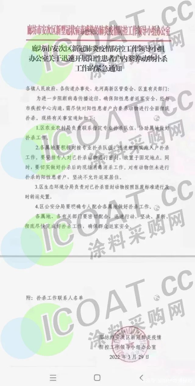網(wǎng)傳廊坊市安次區(qū)防疫辦在2022年3月29日發(fā)布紅頭文件,不僅要“盡快對(duì)陽(yáng)性患者戶內(nèi)豢養(yǎng)動(dòng)物進(jìn)行全面徹底撲殺”,而且“要安排專人對(duì)已撲殺動(dòng)物進(jìn)行密封,放置于固定地點(diǎn)”,并且“對(duì)有動(dòng)物但未進(jìn)行撲殺的陽(yáng)性患者戶,堅(jiān)決不允許返家居住”。