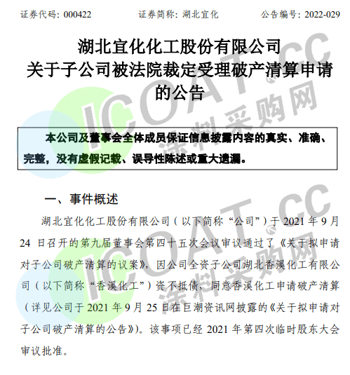 近日,湖北宜化化工股份有限公司發布關于子公司被法院裁定受理破產清算申請的公告,稱因公司全資子公司湖北香溪化工有限公司資不抵債,同意香溪化工申請破產清算。