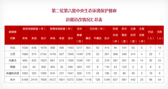 截至4月10日晚22:00,各督察組共收到群眾來電、來信舉報7608件,受理有效舉報6373件,經梳理合并重復舉報,累計向被督察對象轉辦5394件;被督察對象已辦結或階段辦結2083件,其中立案處罰442家;立案偵查25件;約談黨政領導干部98人,問責黨政領導干部54人。