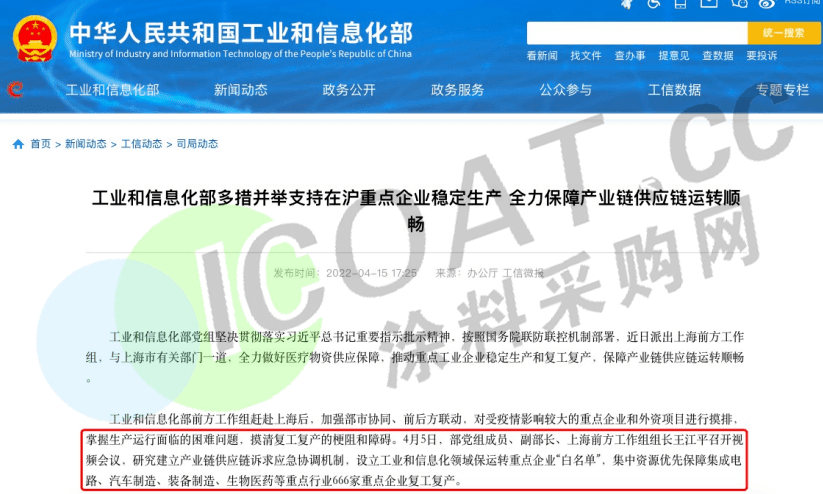 在保障供應鏈方面,工信部也帶來了好消息。4月15日,工業和信息化部網站發布文章稱,工信部近日派出上海前方工作組,與上海市有關部門一道,全力做好醫療物資供應保障,推動重點工業企業穩定生產和復工復產,保障產業鏈供應鏈運轉順暢。