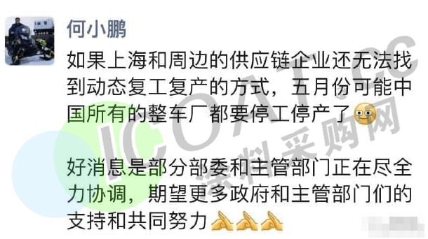 4月14日,小鵬汽車董事長何小鵬通過朋友圈發文稱,如果上海和周邊的供應鏈企業還無法找到動態復工復產的方式,5月份可能中國所有的整車廠都要停工停產了。