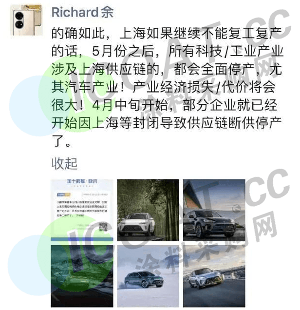 外資企業或者龍頭企業尚且可以在其他地區的工廠進行生產,只是跨省運輸和調配面臨困境,但上海部分中小型本土涂料廠,則面臨徹底“躺平”的處境,無力掙扎。再加上下游房企工程停工,工地全面叫停,汽車企業停產,裝修旺季也憑空消失的慘烈局面,更是叫苦不迭。
