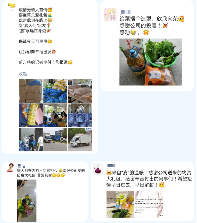 關(guān)愛大禮包在上海各區(qū)穿梭,送到了在封閉小區(qū)的員工手上,讓他們感受到“嘉”的速度與溫暖。許多“嘉”人刷屏寫下感言。