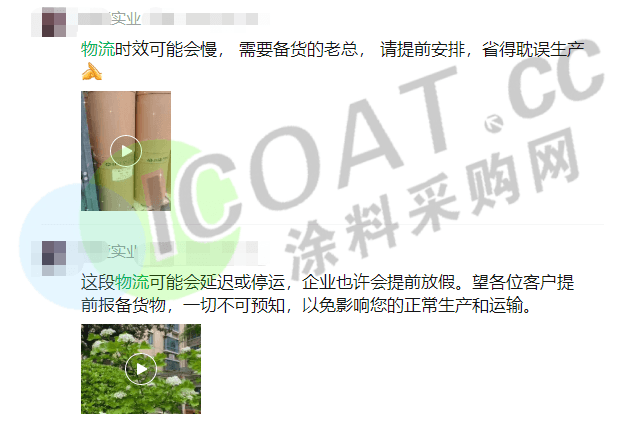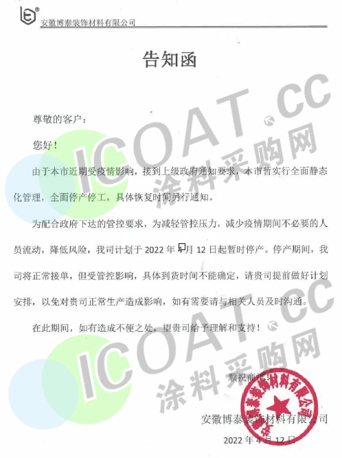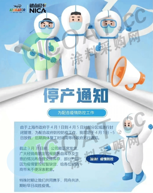 上海涂料企業鱷魚尼卡發布停產通知,表示在4月1日至5日浦西地區輪候封控期間將放假,因此可能會出現部分產品因為疫情管控短暫缺貨的現象,給經銷商帶來不便。目前上海疫情防控政策持續高壓,尚未獲知其是否已經恢復生產。