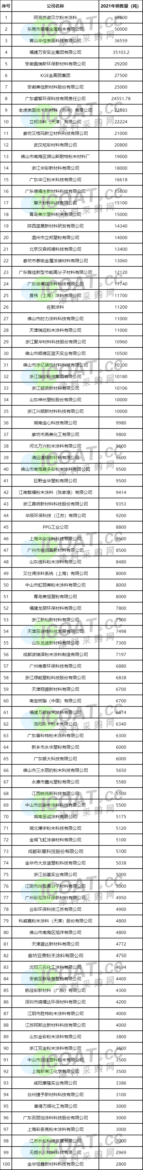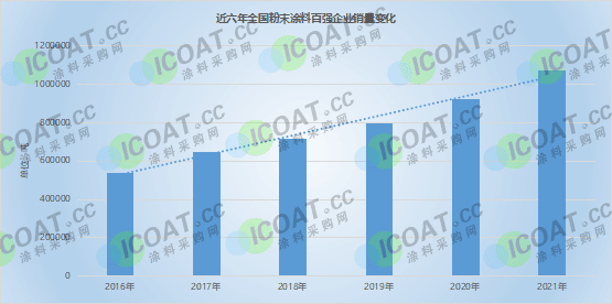 據涂料采購網不完全統計,2021年全國粉末涂料銷售量100強企業的總銷量為1069082.98噸,同比增長16%。其中前三甲分別為阿克蘇諾貝爾粉末涂料、東莞市愛粵金屬粉末有限公司、黃山華佳表面科技有限公司。截至2021年,阿克蘇諾貝爾粉末涂料已連續五年蟬聯百強之首的寶座。