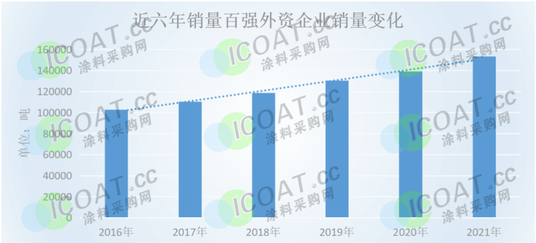從內外資結構上來看,近六年外資企業主要是阿克蘇諾貝爾粉末涂料、老虎、佐敦、PPG、立邦、宣偉、艾仕得等企業,并無其它外資企業進入,但是從下圖來看,外資企業在國內市場的粉末涂料銷售量呈現上漲態勢,在存量以至于減量市場之下,外資企業的市場份額在增大,就意味著民族企業的市場份額在下滑。據涂料采購網不完全統計,2021年粉末涂料銷量百強企業中外資企業銷量同比增長10%。
