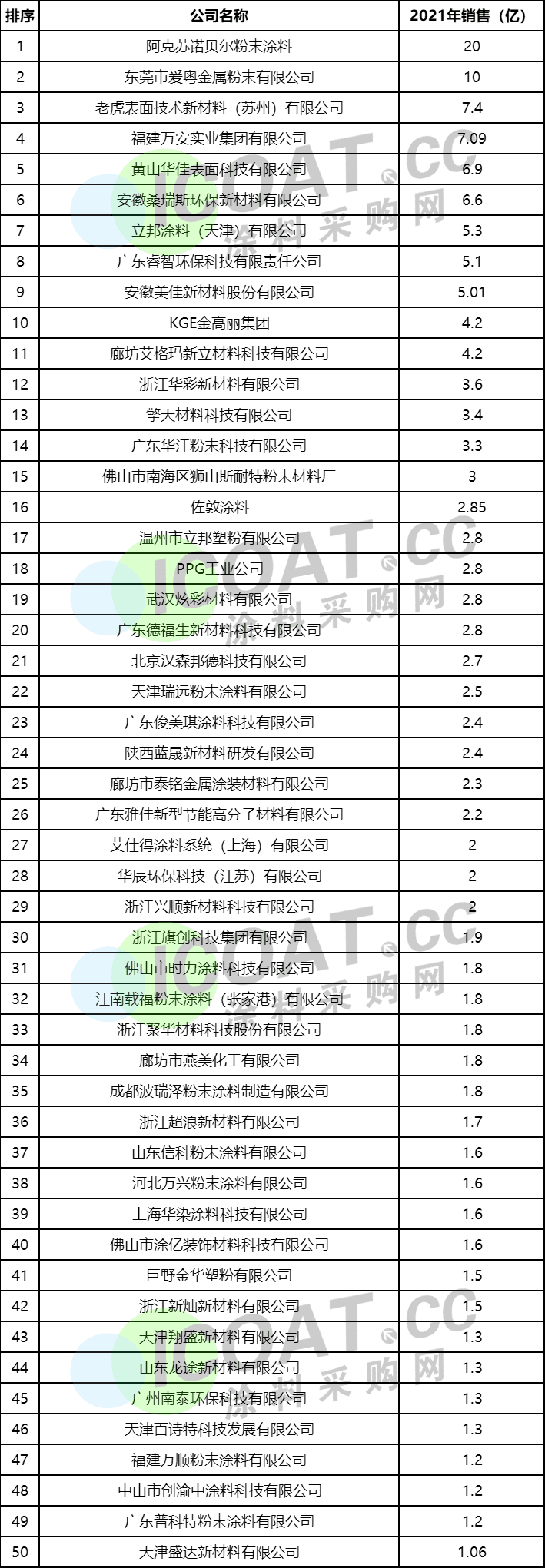 銷量是衡量一個企業市場占有率的參考值,而銷售額則是衡量一個企業市場銷售情況的重要指標。據涂料采購網不完全統計,2021年銷量50強粉末涂料企業總銷售額為160.76億元,同比增長17%。其中阿克蘇諾貝爾粉末涂料2021年的總銷售額為20億,相當于2個東莞愛粵金屬粉末有限公司的銷售額,更相當于3個老虎表面科技新材料(蘇州)有限公司,穩坐頭把交椅。