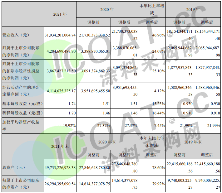 近日,A股涂料上市公司東方雨虹發布2021年年度報告,2021年營業收入約319.34億元,同比增加46.96%,歸屬于上市公司股東的凈利潤約42.05億元,同比增加24.07%。看起來是營收、凈利雙增長的亮眼成績,實際上凈利增速下降明顯。