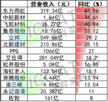 部分涂料企業2021年營收情況