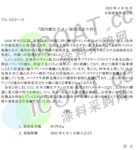 日本石原:由于鈦礦和煤炭等原材料價格持續上漲,自6月1日起,鈦白粉價格上調60日元/公斤(約500美元/噸)。