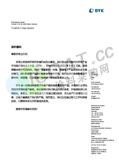 畢克化學:自6月1日起,在全球范圍內對公司所有產品進行不同程度的調漲,平均漲價25%。