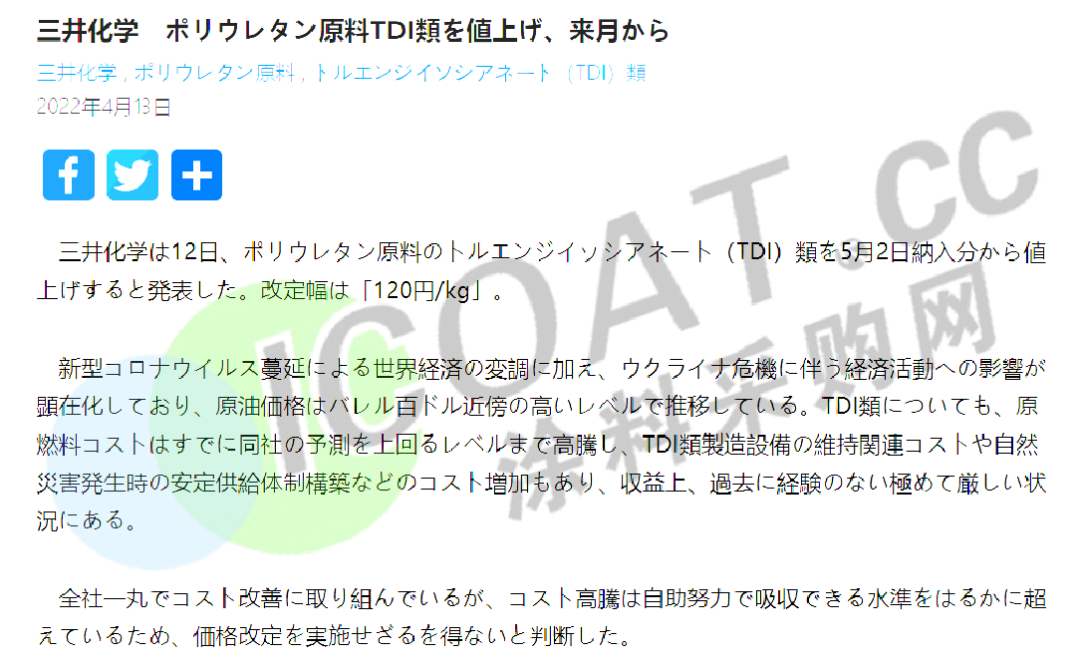 三井化學:5月2日起上調聚氨酯原料甲苯二異氰酸酯 (TDI) 的價格,調漲120日元/kg(約合6060元/噸)。