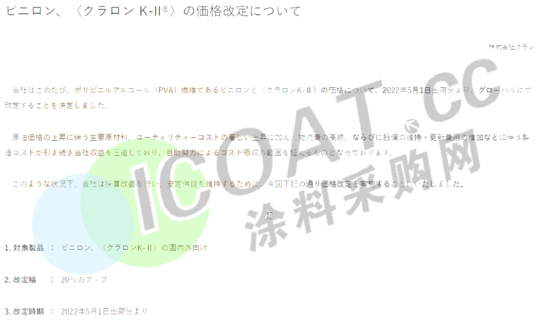 可樂麗:5月1日起,將對聚乙烯醇( PVA )纖維維尼綸和〈克拉倫K-Ⅱ〉的價格進行全球范圍內的上調,漲幅高達20%。