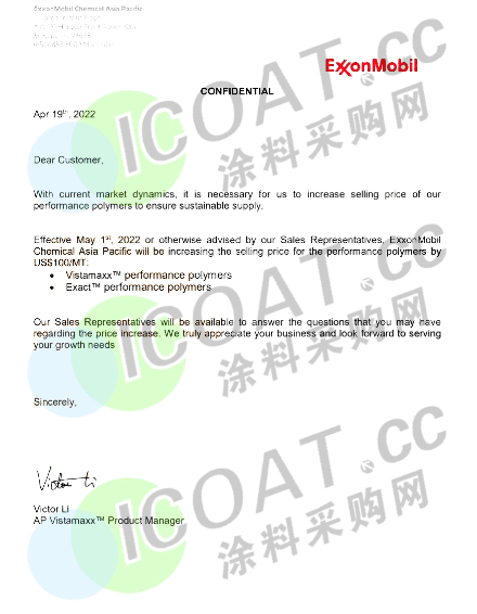 埃克森美孚:自5月1日起,將提高亞太地區高性能聚合物(POE)的銷售價格,上漲100美元/噸(約合641元/噸)。