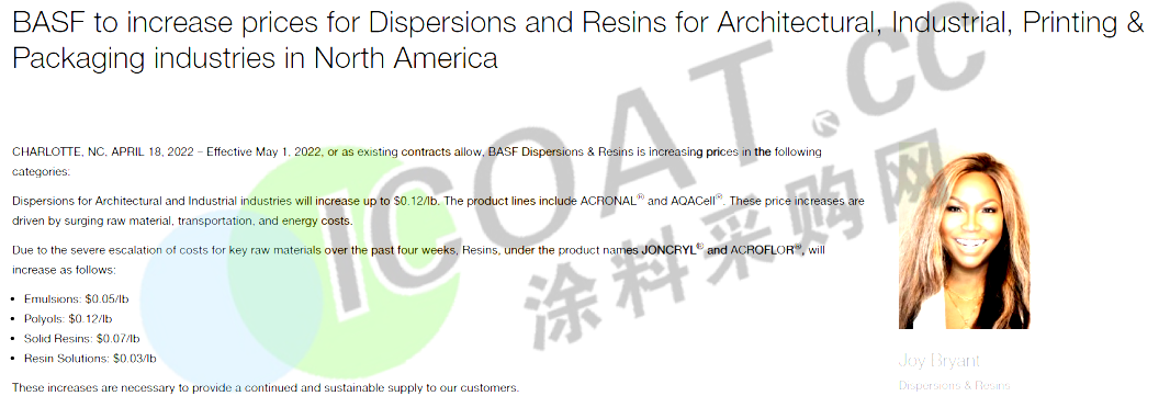 巴斯夫:自5月1日起,提高分散體和樹脂價格,乳液上調0.05美元/磅(約706元/噸),多元醇上調0.12美元/磅(1695元/噸),固體樹脂上調0.07美元/磅(989元/噸),樹脂溶液上調0.03美元/磅(424元/噸)。