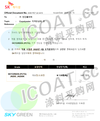 SK化學:自5月開始,將提高PCTG 韓國SK JN200/JN200K產品售價,上調120韓元/kg(約合人民幣622元/噸)。