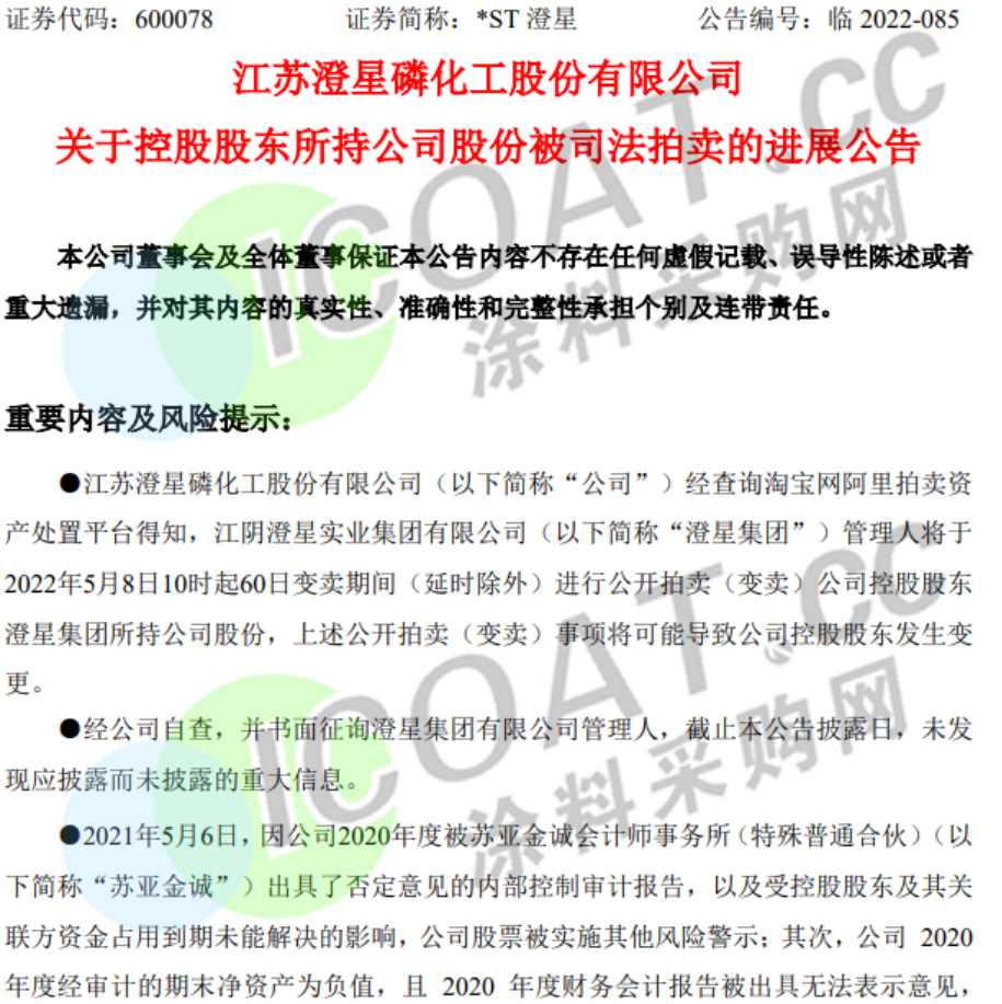 近日,江蘇澄星磷化工發(fā)布關(guān)于控股股東所持公司股份被司法拍賣的進(jìn)展公告,稱經(jīng)查詢淘寶網(wǎng)阿里拍賣資產(chǎn)處置平臺(tái)得知,澄星集團(tuán)管理人將于 2022年5月8日10時(shí)起60日變賣期間(延時(shí)除外)進(jìn)行公開(kāi)拍賣(變賣)公司控股股東澄星集團(tuán)所持公司股份,上述公開(kāi)拍賣(變賣)事項(xiàng)將可能導(dǎo)致公司控股股東發(fā)生變更。