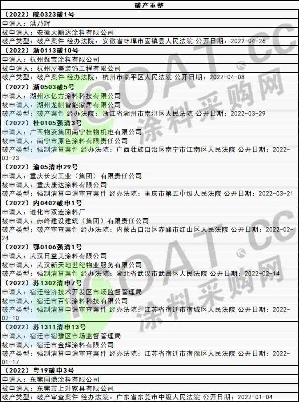 部分涂料企業(yè)破產(chǎn)重整名單
