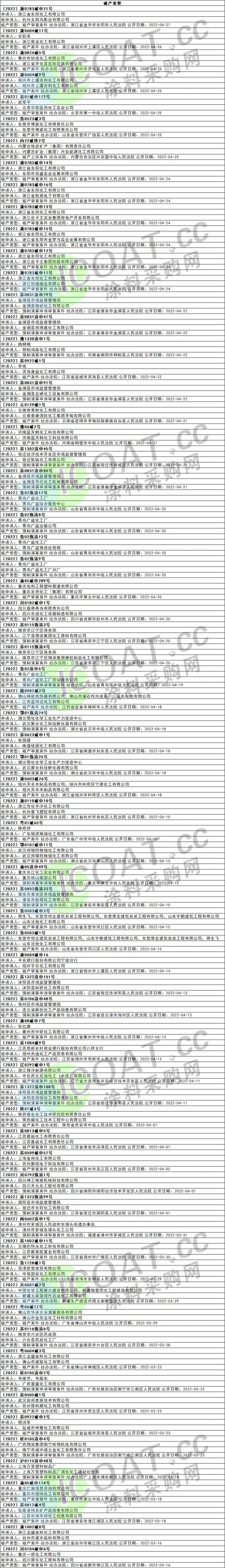 還有數(shù)百家化工企業(yè)自己申請(qǐng)或被其他企業(yè)申請(qǐng)破產(chǎn)重整,正式走向了“滅亡”之路。